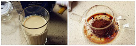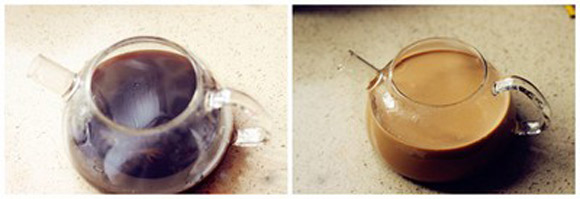 2. Thêm kem tươi và sữa vào nước trà, khuấy đều rồi đổ vào ấm. Đổ cà phê vào, thêm 250ml nước sôi, tiếp tục khuấy đều cho cà phê tan hoàn toàn.